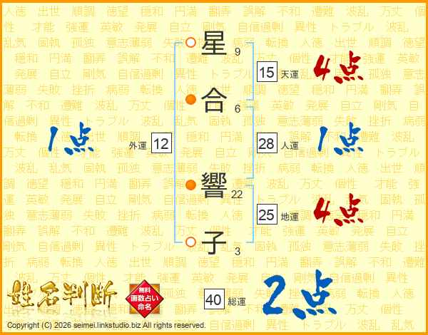 生活面を象徴する運勢です。外部から受ける影響力を表し、結婚運、家庭運や職場、環境への順応性を表します。総運から人運を引いた画数。姓や名が1文字の場合を除く。