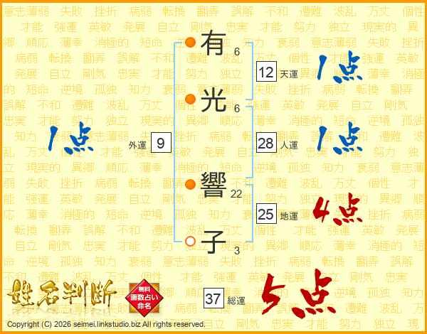 生活面を象徴する運勢です。外部から受ける影響力を表し、結婚運、家庭運や職場、環境への順応性を表します。総運から人運を引いた画数。姓や名が1文字の場合を除く。