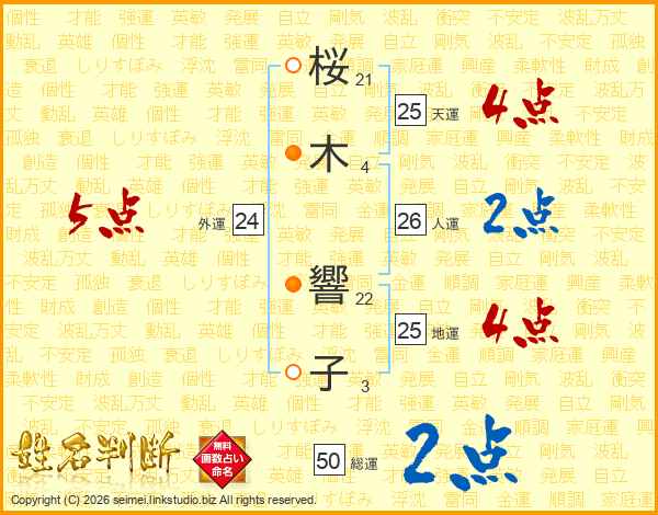 桜(21画)木(4画) 響(22画)子(3画)