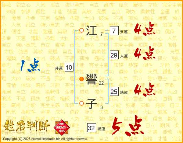 生活面を象徴する運勢です。外部から受ける影響力を表し、結婚運、家庭運や職場、環境への順応性を表します。総運から人運を引いた画数。姓や名が1文字の場合を除く。