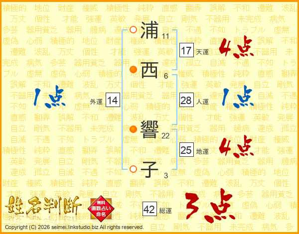 浦(11画)西(6画) 響(22画)子(3画)