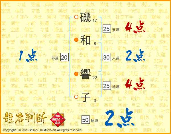 生活面を象徴する運勢です。外部から受ける影響力を表し、結婚運、家庭運や職場、環境への順応性を表します。総運から人運を引いた画数。姓や名が1文字の場合を除く。