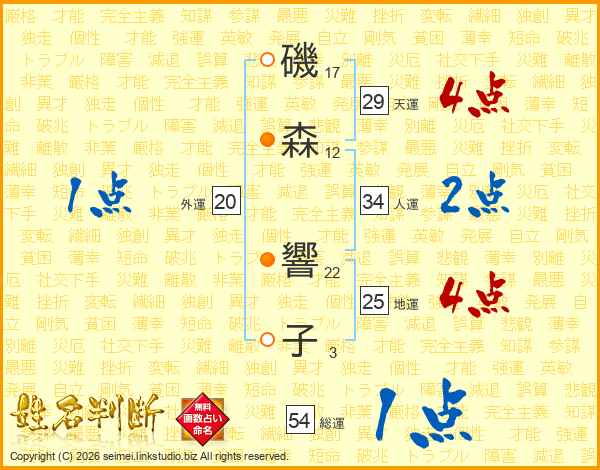 生活面を象徴する運勢です。外部から受ける影響力を表し、結婚運、家庭運や職場、環境への順応性を表します。総運から人運を引いた画数。姓や名が1文字の場合を除く。