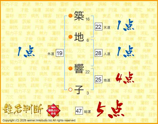 生活面を象徴する運勢です。外部から受ける影響力を表し、結婚運、家庭運や職場、環境への順応性を表します。総運から人運を引いた画数。姓や名が1文字の場合を除く。