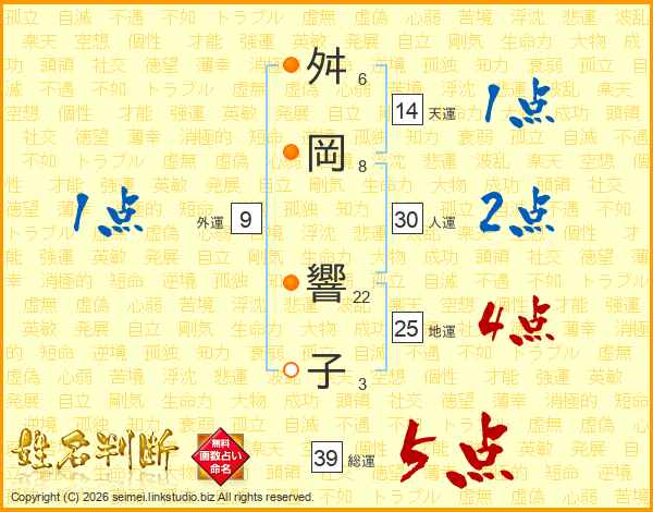 舛(6画)岡(8画) 響(22画)子(3画)