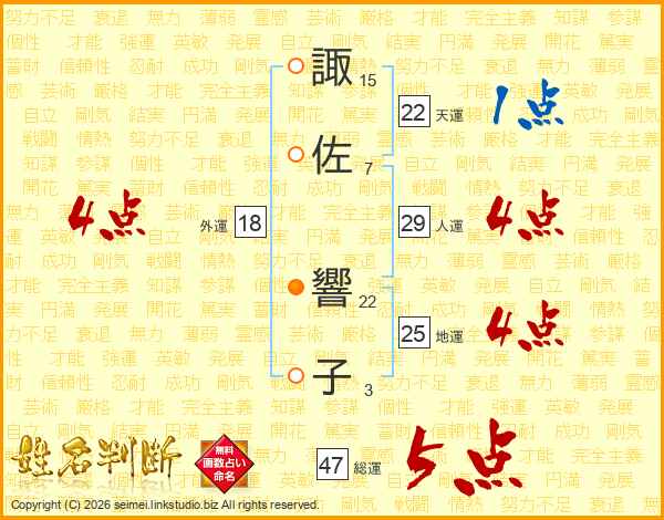 諏(15画)佐(7画) 響(22画)子(3画)
