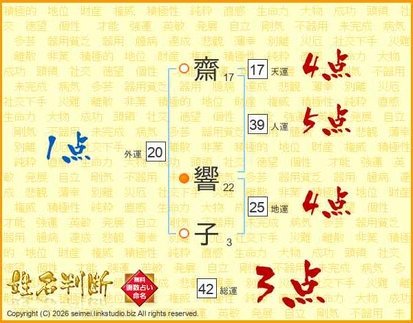 生活面を象徴する運勢です。外部から受ける影響力を表し、結婚運、家庭運や職場、環境への順応性を表します。総運から人運を引いた画数。姓や名が1文字の場合を除く。