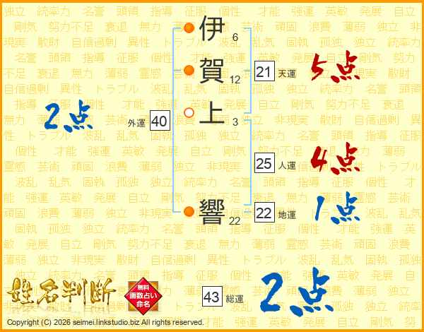 生活面を象徴する運勢です。外部から受ける影響力を表し、結婚運、家庭運や職場、環境への順応性を表します。総運から人運を引いた画数。姓や名が1文字の場合を除く。