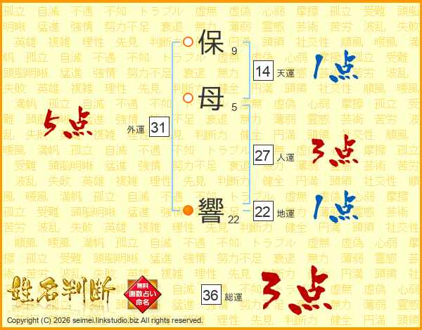 生活面を象徴する運勢です。外部から受ける影響力を表し、結婚運、家庭運や職場、環境への順応性を表します。総運から人運を引いた画数。姓や名が1文字の場合を除く。