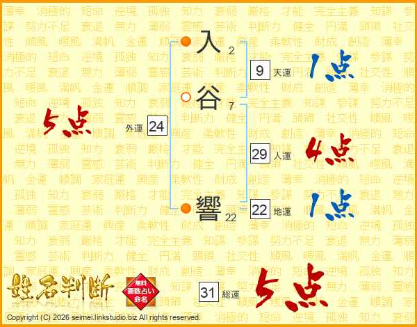 生活面を象徴する運勢です。外部から受ける影響力を表し、結婚運、家庭運や職場、環境への順応性を表します。総運から人運を引いた画数。姓や名が1文字の場合を除く。