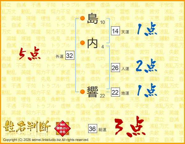 生活面を象徴する運勢です。外部から受ける影響力を表し、結婚運、家庭運や職場、環境への順応性を表します。総運から人運を引いた画数。姓や名が1文字の場合を除く。