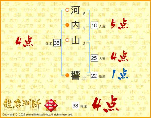 生活面を象徴する運勢です。外部から受ける影響力を表し、結婚運、家庭運や職場、環境への順応性を表します。総運から人運を引いた画数。姓や名が1文字の場合を除く。