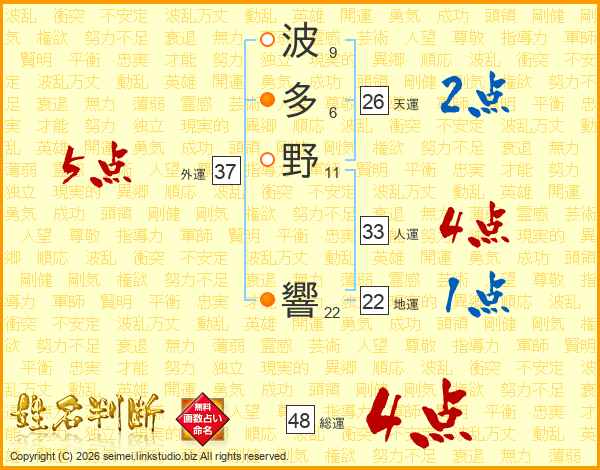 生活面を象徴する運勢です。外部から受ける影響力を表し、結婚運、家庭運や職場、環境への順応性を表します。総運から人運を引いた画数。姓や名が1文字の場合を除く。