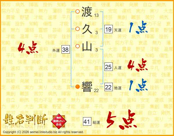 渡(13画)久(3画)山(3画) 響(22画)