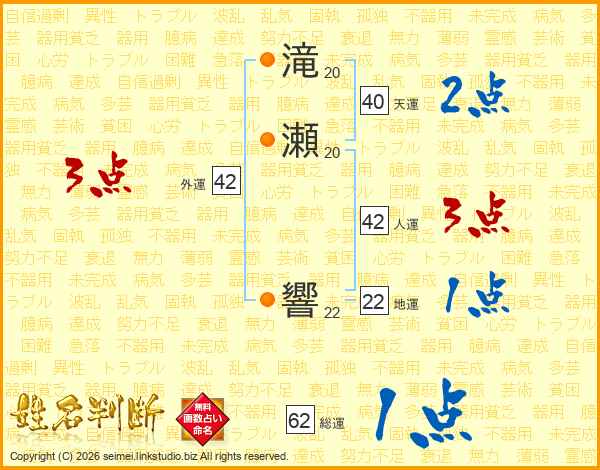 滝瀬響さんの総運は62画の1点!