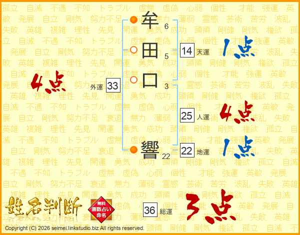 生活面を象徴する運勢です。外部から受ける影響力を表し、結婚運、家庭運や職場、環境への順応性を表します。総運から人運を引いた画数。姓や名が1文字の場合を除く。