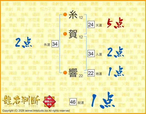 生活面を象徴する運勢です。外部から受ける影響力を表し、結婚運、家庭運や職場、環境への順応性を表します。総運から人運を引いた画数。姓や名が1文字の場合を除く。