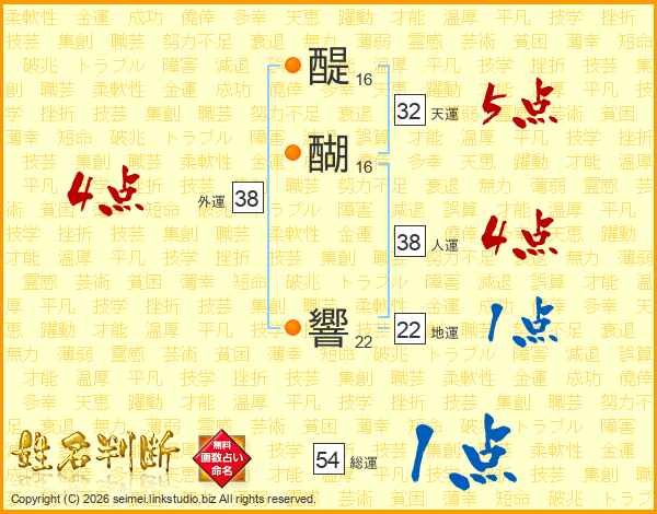生活面を象徴する運勢です。外部から受ける影響力を表し、結婚運、家庭運や職場、環境への順応性を表します。総運から人運を引いた画数。姓や名が1文字の場合を除く。