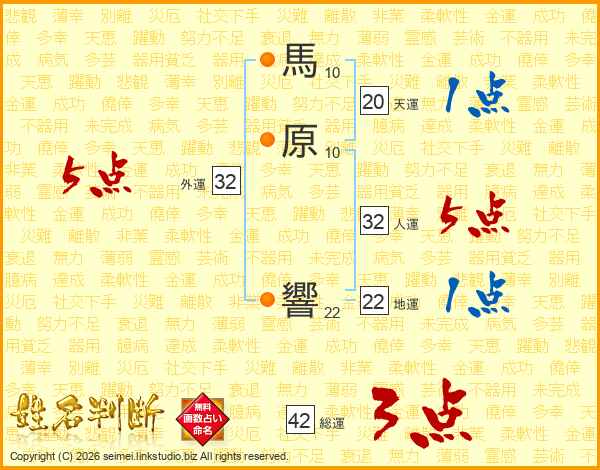 生活面を象徴する運勢です。外部から受ける影響力を表し、結婚運、家庭運や職場、環境への順応性を表します。総運から人運を引いた画数。姓や名が1文字の場合を除く。