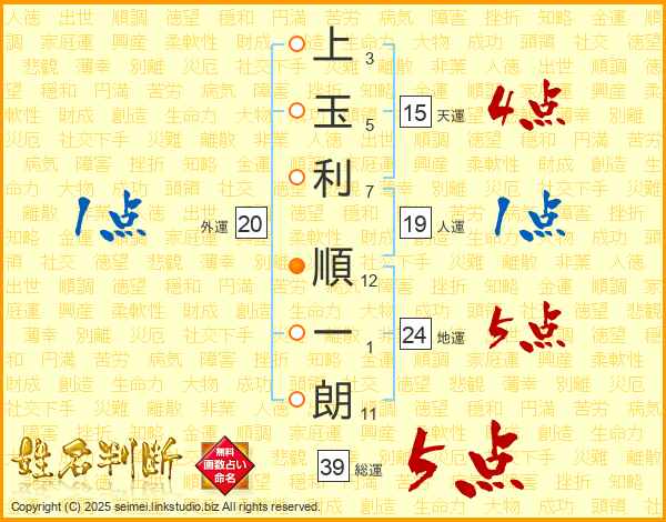 上(3画)玉(5画)利(7画) 順(12画)一(1画)朗(11画)