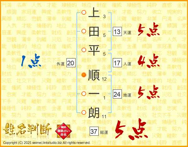 上(3画)田(5画)平(5画) 順(12画)一(1画)朗(11画)