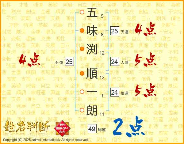 五(5画)味(8画)渕(12画) 順(12画)一(1画)朗(11画)