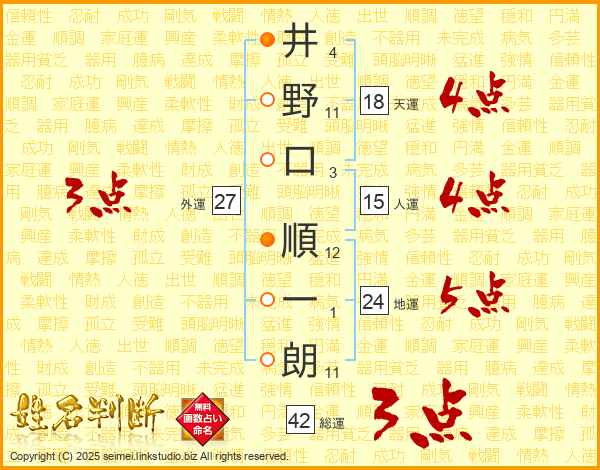 井(4画)野(11画)口(3画) 順(12画)一(1画)朗(11画)