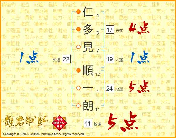 仁(4画)多(6画)見(7画) 順(12画)一(1画)朗(11画)