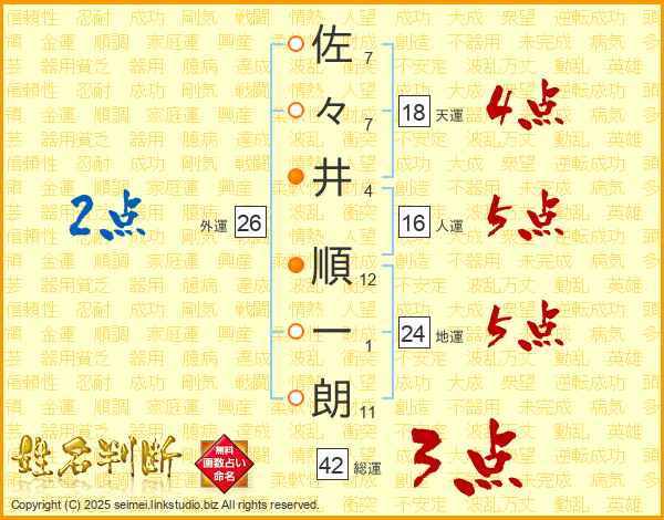 佐(7画)々(7画)井(4画) 順(12画)一(1画)朗(11画)