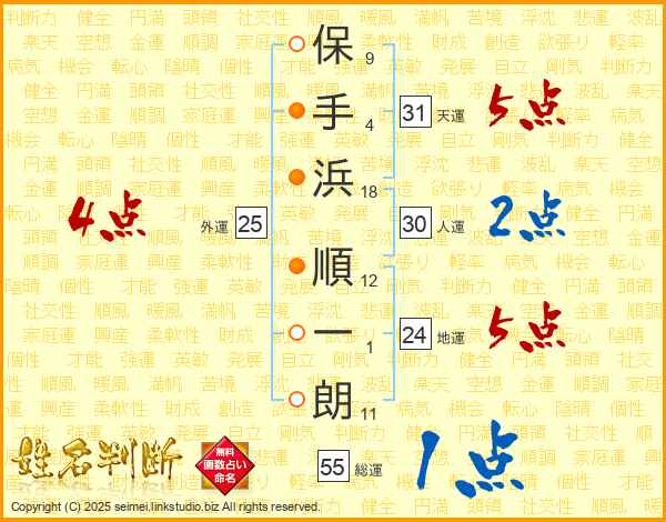 保(9画)手(4画)浜(18画) 順(12画)一(1画)朗(11画)
