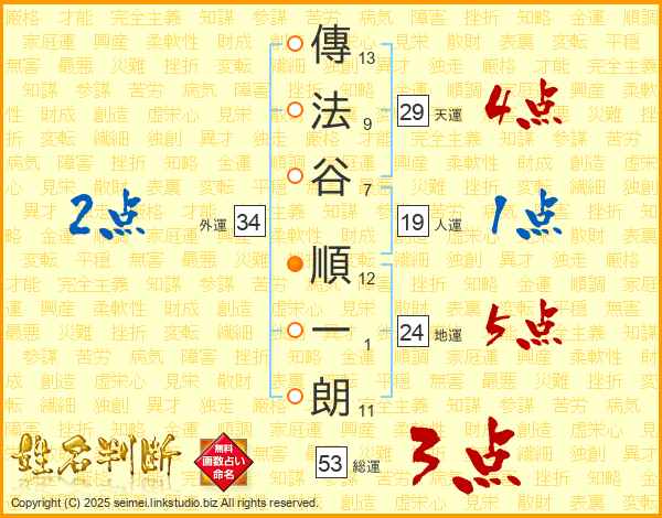 あなたの人生を表す1番重要な運勢です。生涯を通じて影響する総合運となり、主に50歳以降の晩年期に影響を及ぼします。苗字と名前の合計画数。