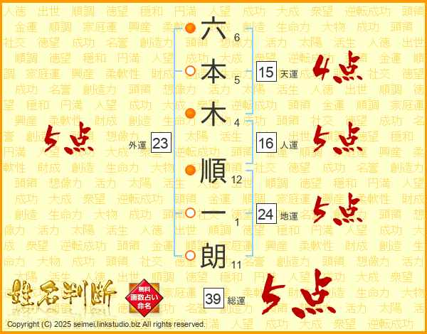 六(6画)本(5画)木(4画) 順(12画)一(1画)朗(11画)