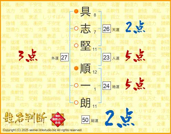 具(8画)志(7画)堅(11画) 順(12画)一(1画)朗(11画)