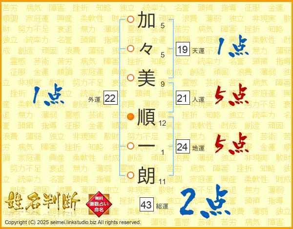 加(5画)々(5画)美(9画) 順(12画)一(1画)朗(11画)