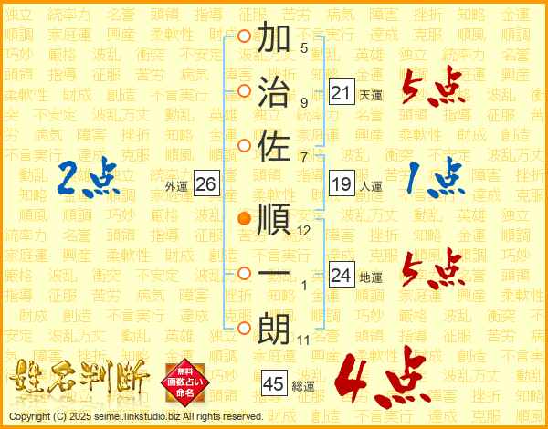 加(5画)治(9画)佐(7画) 順(12画)一(1画)朗(11画)