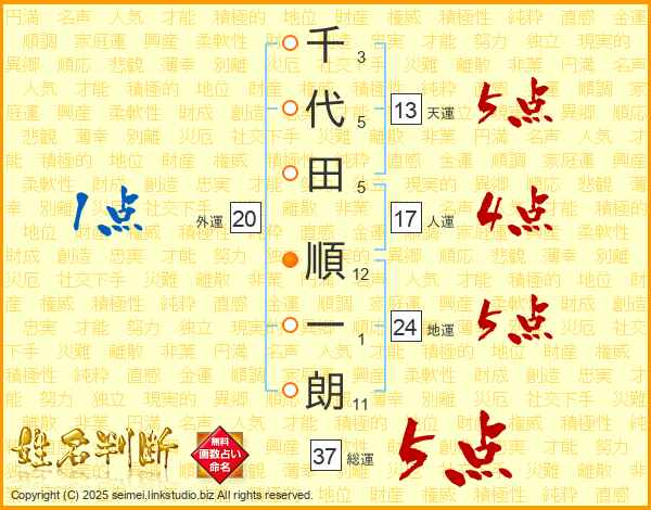 千(3画)代(5画)田(5画) 順(12画)一(1画)朗(11画)