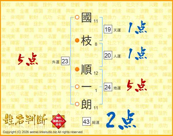 國(11画)枝(8画) 順(12画)一(1画)朗(11画)
