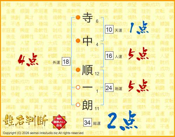 寺(6画)中(4画) 順(12画)一(1画)朗(11画)