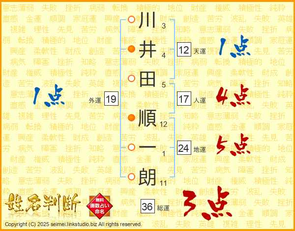 川(3画)井(4画)田(5画) 順(12画)一(1画)朗(11画)