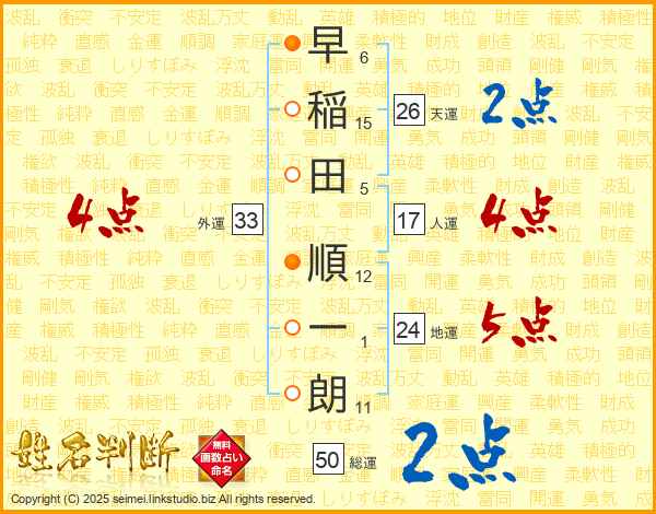 早(6画)稲(15画)田(5画) 順(12画)一(1画)朗(11画)