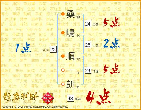 桑(10画)嶋(14画) 順(12画)一(1画)朗(11画)