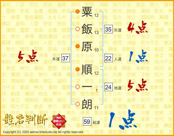 粟(12画)飯(13画)原(10画) 順(12画)一(1画)朗(11画)