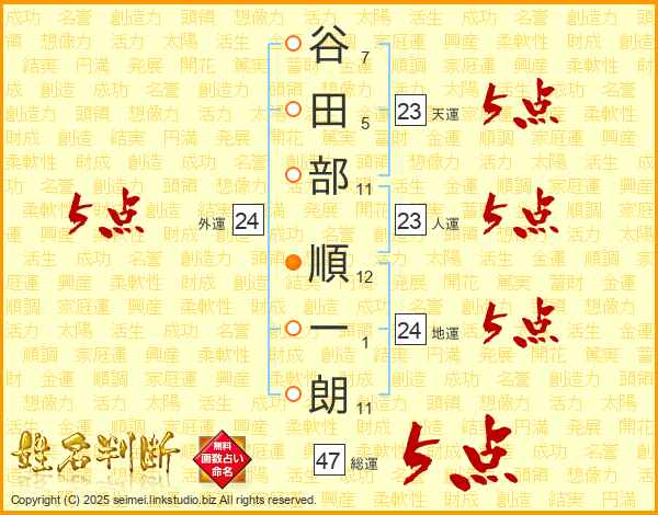 谷(7画)田(5画)部(11画) 順(12画)一(1画)朗(11画)