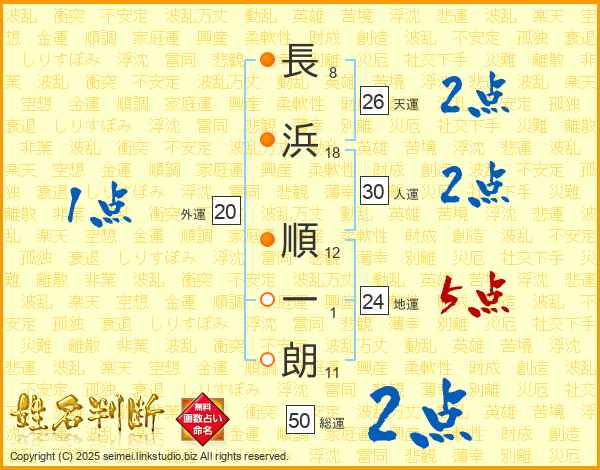 長(8画)浜(18画) 順(12画)一(1画)朗(11画)