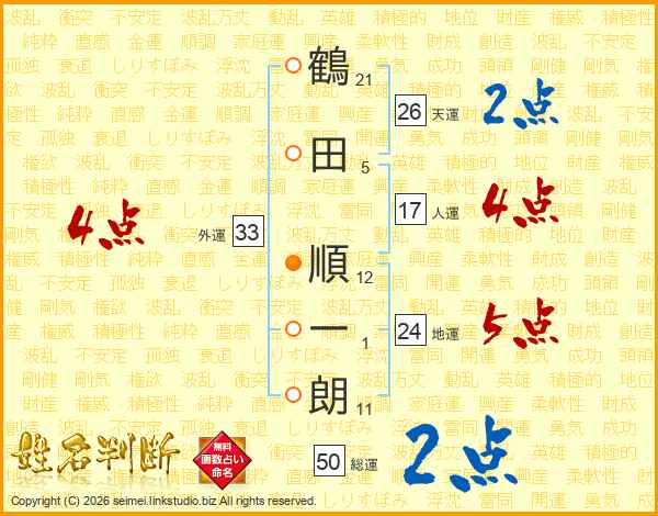 鶴(21画)田(5画) 順(12画)一(1画)朗(11画)