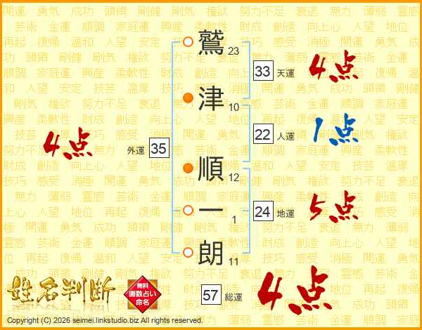 鷲(23画)津(10画) 順(12画)一(1画)朗(11画)