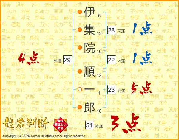 伊(6画)集(12画)院(10画) 順(12画)一(1画)郎(10画)
