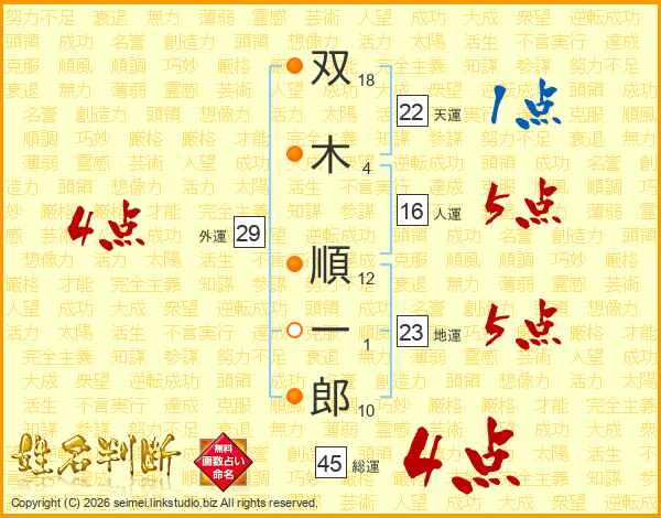 双(18画)木(4画) 順(12画)一(1画)郎(10画)