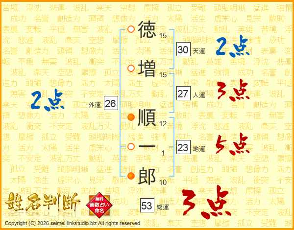 徳(15画)増(15画) 順(12画)一(1画)郎(10画)