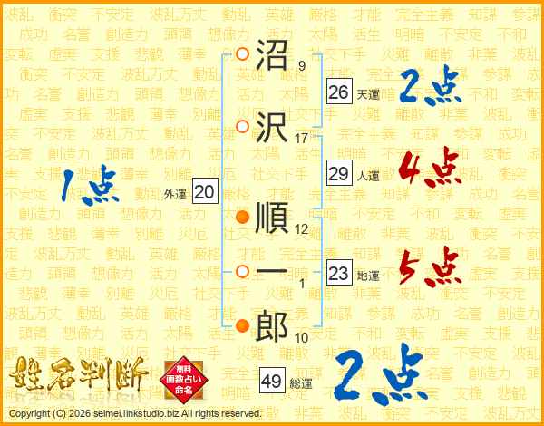 沼(9画)沢(17画) 順(12画)一(1画)郎(10画)